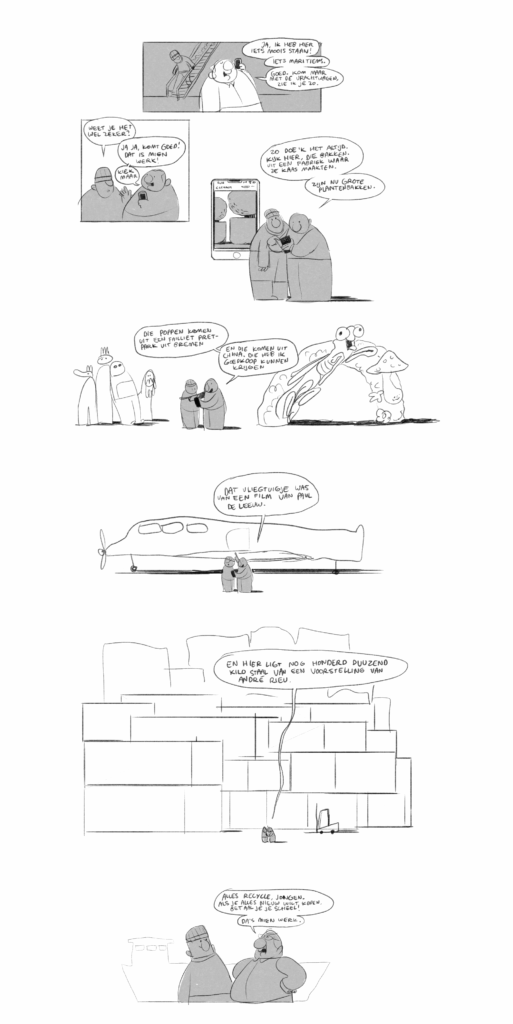 Omdat het een geïllustreerd verhaal is, moesten we uiteraard zuinig zijn met tekst. Er moest zo min mogelijk mooischrijverij in, omdat het volledig moest draaien om de afbeeldingen. Daar moesten we het verhaal mee vertellen, daar moesten we de spanning mee opwekken. Dat was soms lastig, omdat we ook goed wilden uitleggen dat dit verhaal stond voor veel meer dan de lotgevallen van Van der Most alleen; het verhaal over het pretpark dat er nooit kwam, staat ook voor de toenemende regeldruk in Nederland die veel ondernemers zeggen te ervaren. Het staat voor de almaar stijgende grondprijzen in de Randstad waardoor het steeds lastiger wordt te pionieren. Enzovoorts. Maar omdat we die zaken niet al te letterlijk konden benoemen, hebben we geprobeerd al die thema’s te vatten in korte scènes (waarin ook elke keer iets moest gebeuren om de lezers niet kwijt te raken).